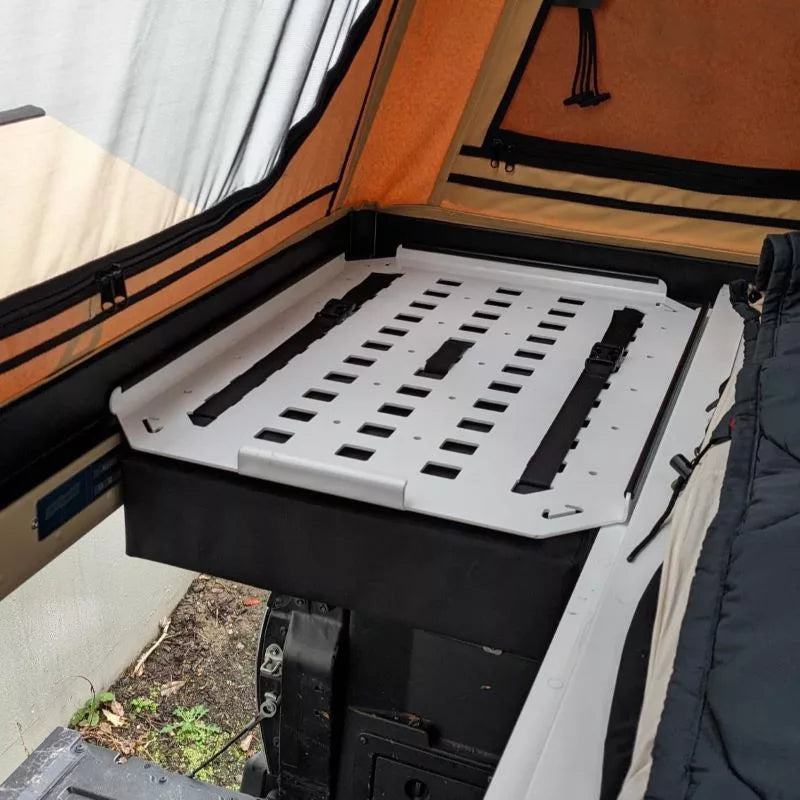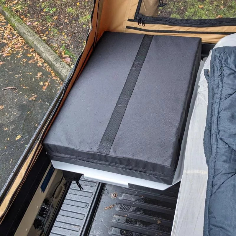 The Crash Pad cushion mounts directly to the removable pass through floor panel. When you're ready to close down your tent, just flip the cusion side over to store it out of the way in your closed camper.