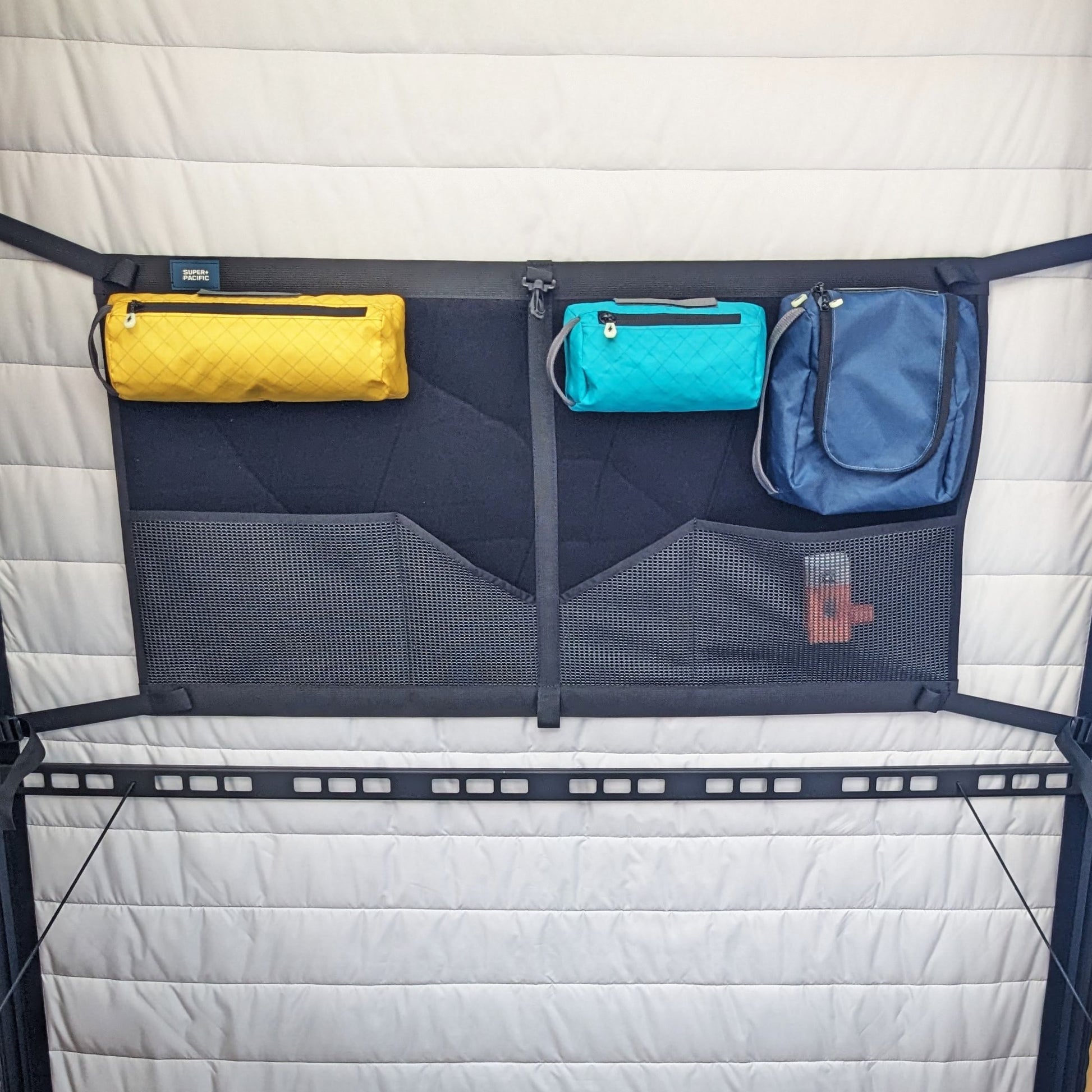 Rest easy on your next adventure, with the ultimate gear storage solution for your tent. The HuckPack Gear Loft helps keep your nighttime essentials within arm's reach, with roomy mesh pockets for stowing an iPad, books, toiletries, or a cold-weather beanie. The large, loop-backed panel allows you to mount the pouches and packing cubes from your other HuckPack storage solutions.