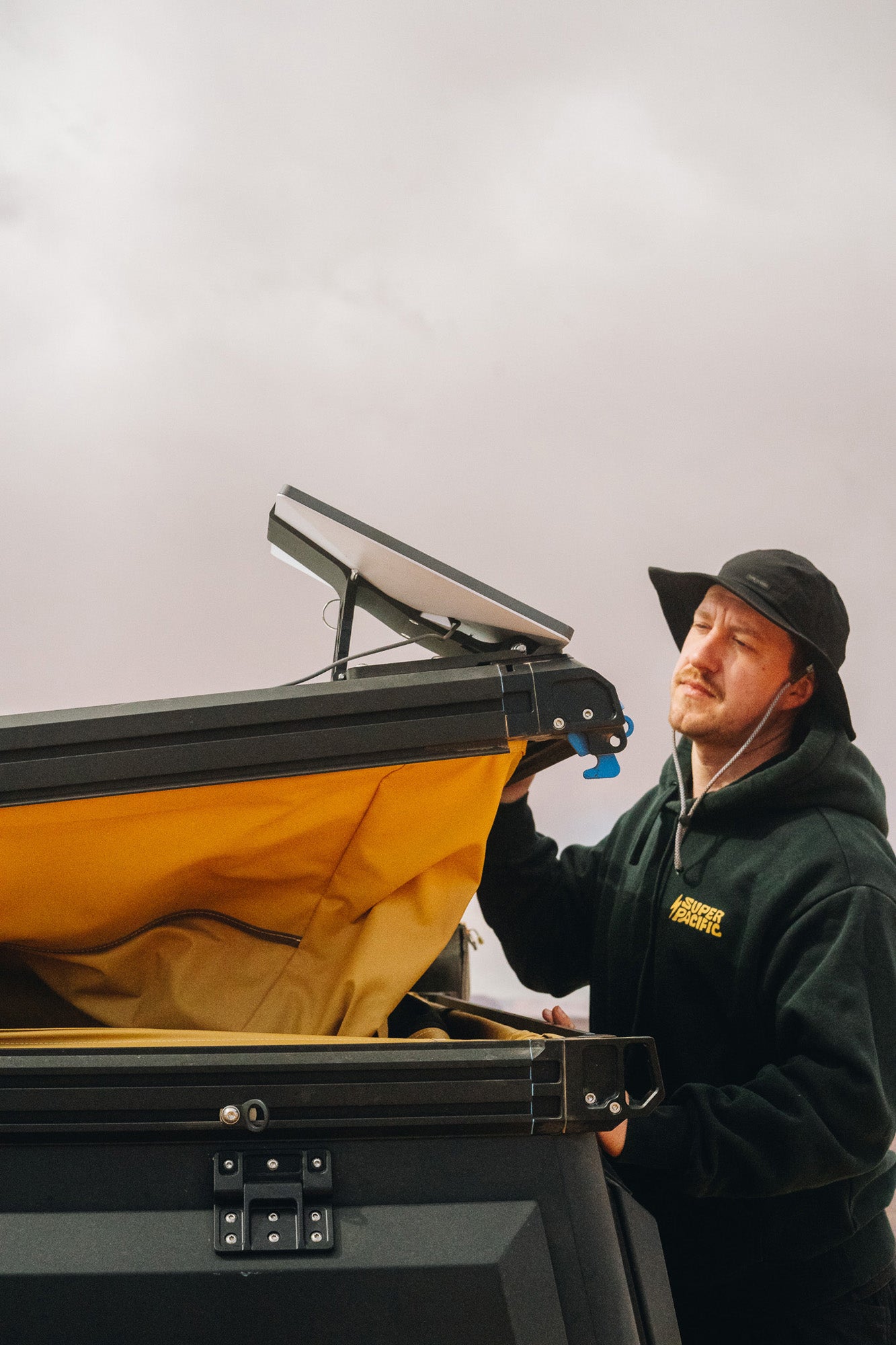 Camp Mode: Pull the pin and use the kick stand to face the dish facing upward for maximum signal while the tent is open. The angle matches the X1's open tent, keeping the dish flat to the sky.